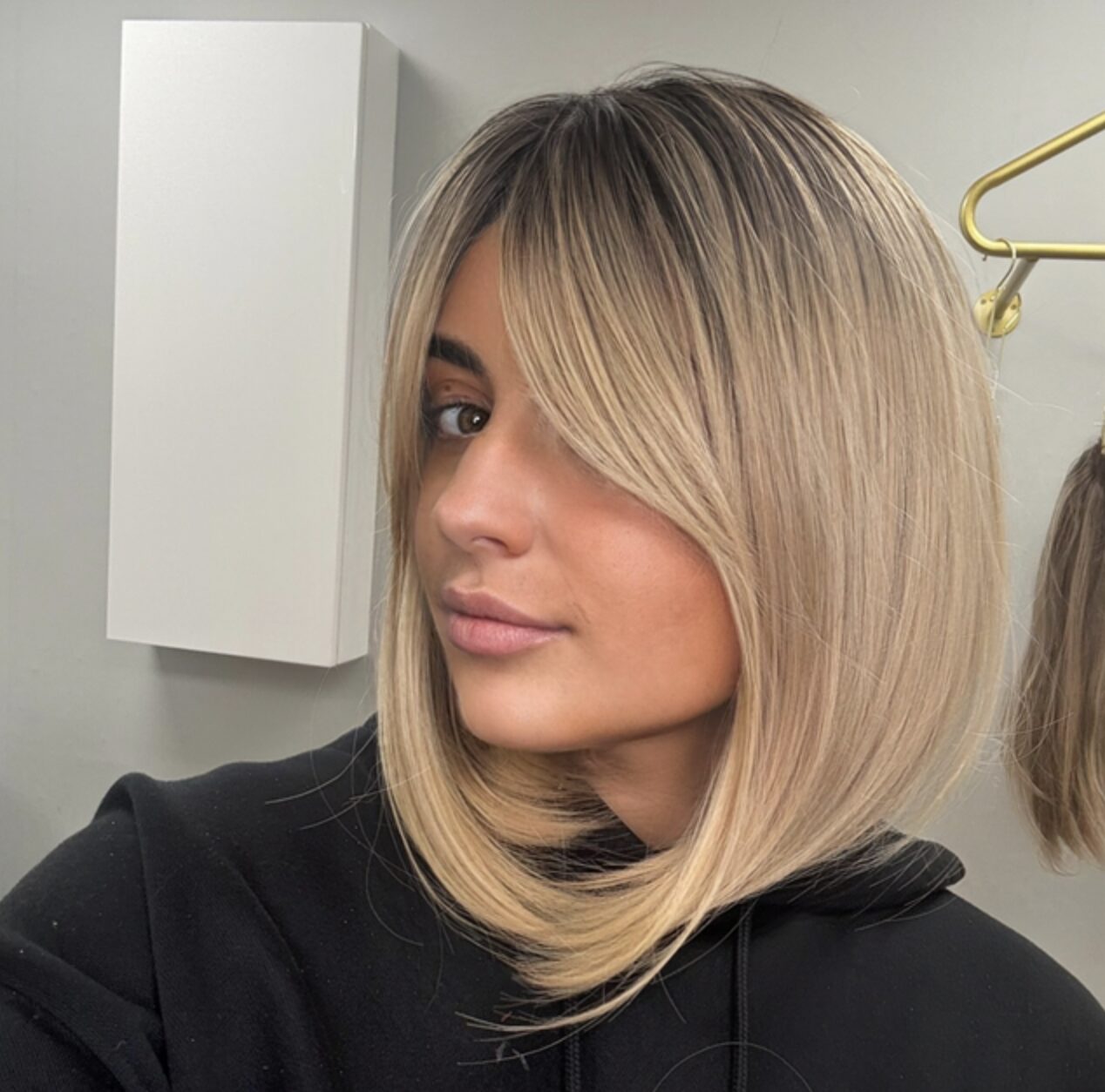 Rooted blonde synthetic wig with fringe